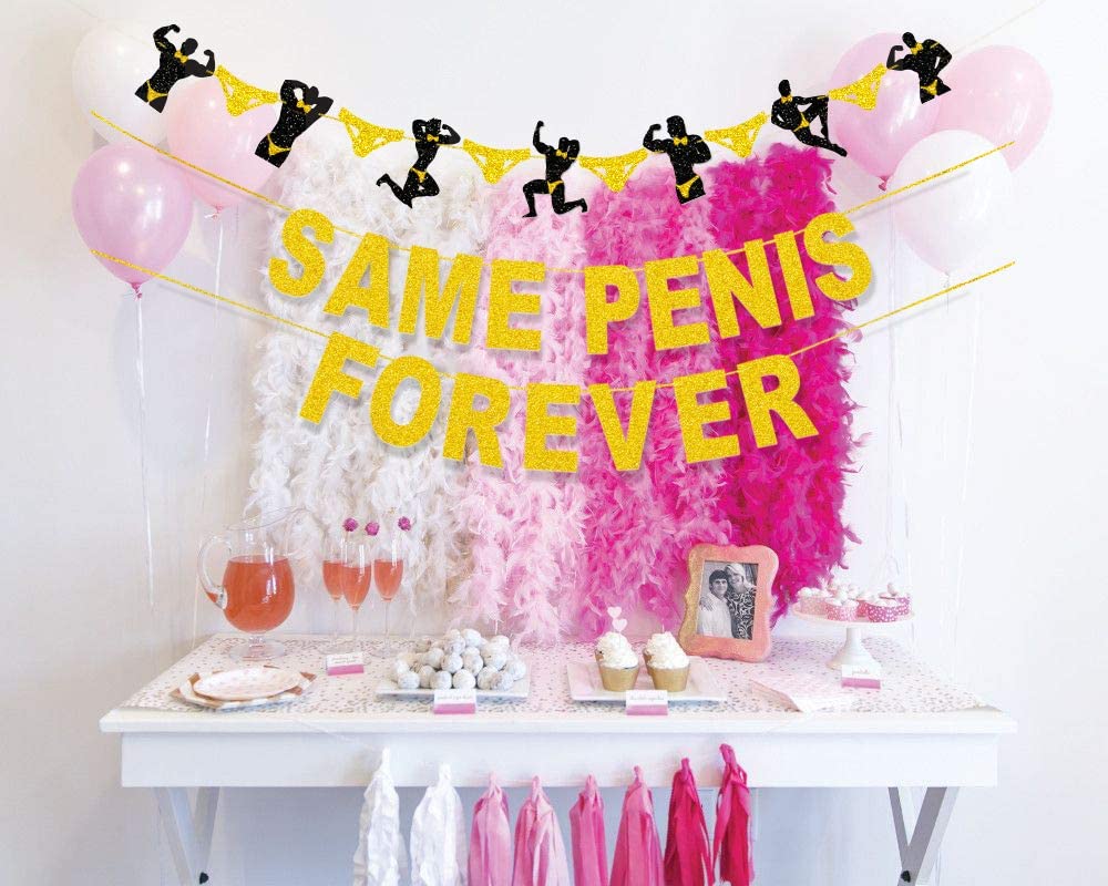Make your bachelorette party unforgettable with this hilarious and bold "Same Penis Forever" banner! Featuring sparkling gold letters and a cheeky garland of muscle-bound men in golden underwear, this decoration is guaranteed to get laughs and set the mood for a night of wild fun. Perfect for bridesmaids, best friends, and unforgettable bridal celebrations. Easy to hang, reusable, and totally Instagram-worthy!