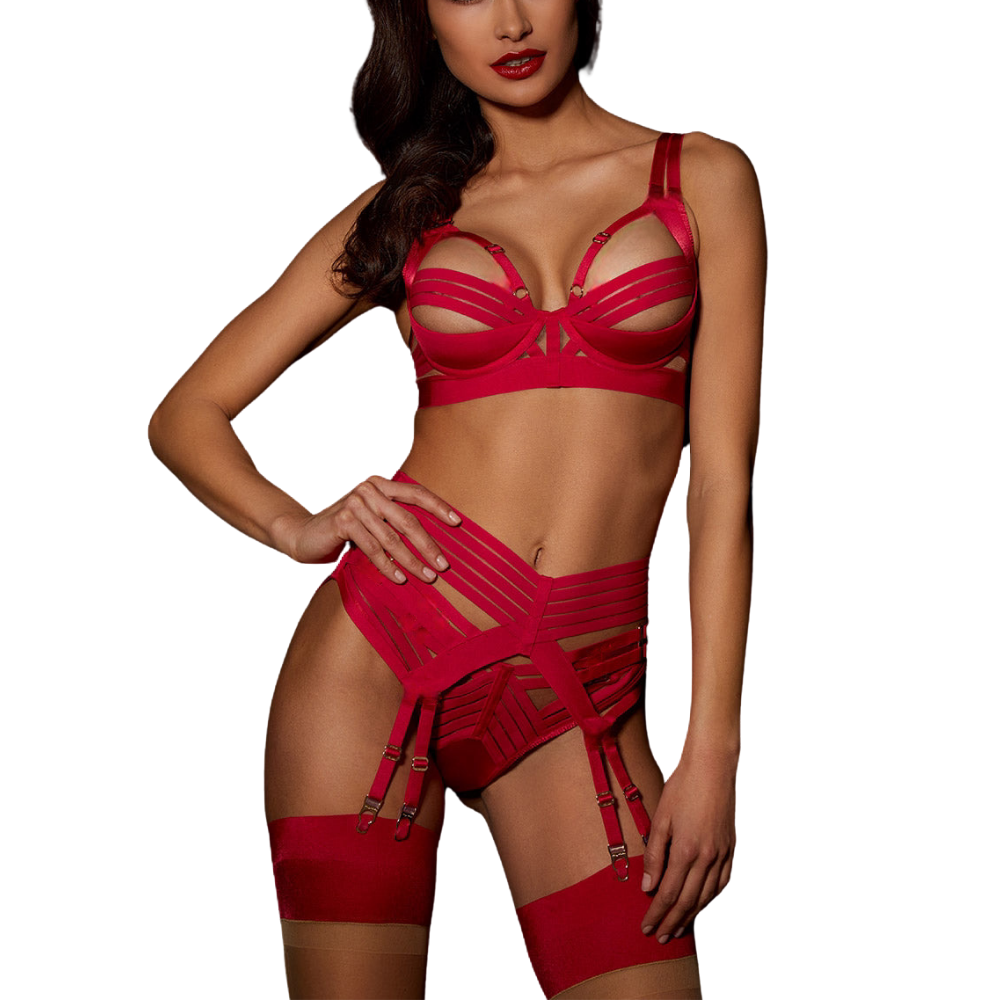 Σετ εσωρούχων ESME 4 τεμαχίων με σουτιέν με μπανέλα για στήριξη του στήθους και στραπς στο μπούστο και ασορτί στρίνγκ συνοδευόμενο από παιχνιδιάρικη ζώνη ζαρτιέρας για να σου χαρίσει ερωτικές στιγμές κάθε βράδυ που θα το φοράς στο έπακρο! Τα δελεαστικά του ανοίγματα είναι σχεδιασμένα να κολακεύουν το στήθος και τα πολλά στραπς να συγχέουν τη φαντασία!