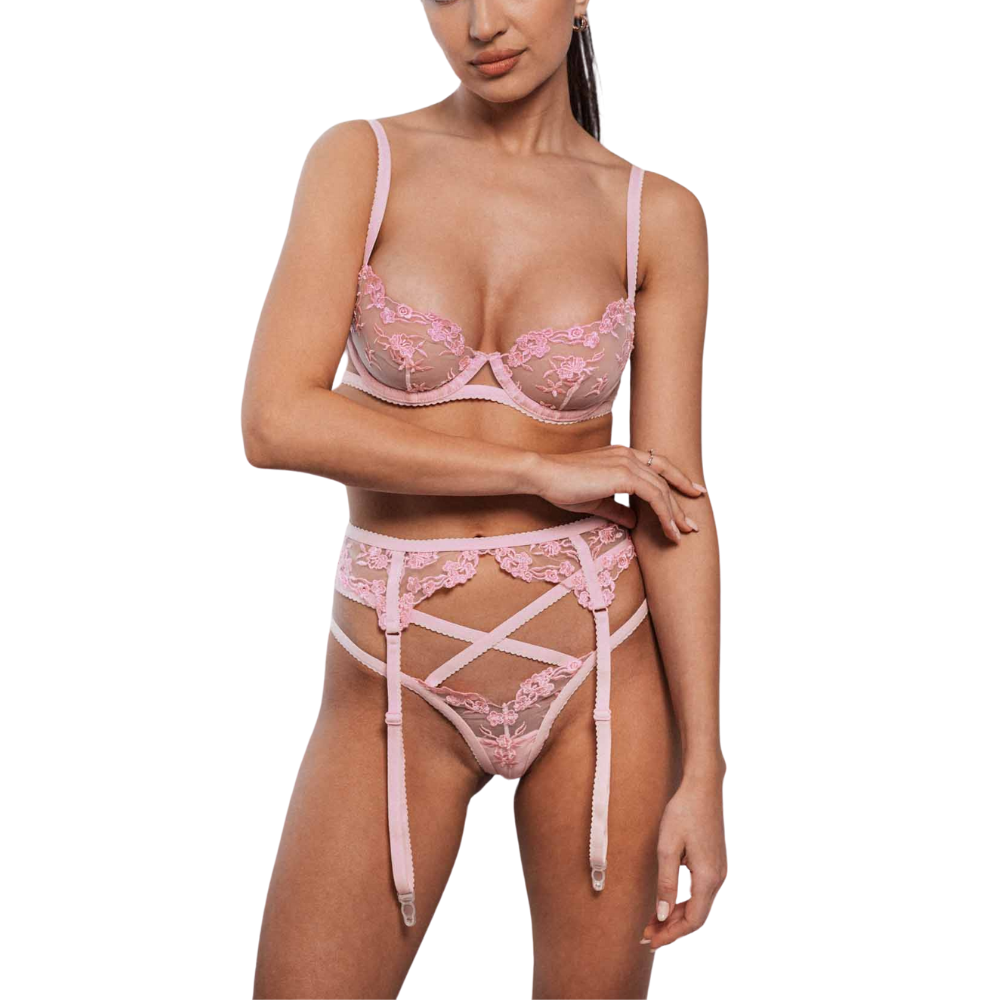 Σας παρουσιάζουμε το εντυπωσιακό σετ εσωρούχων FLEURINE, ένα όμορφο και γλυκό σύνολο φτιαγμένο από λεπτή ροζ δαντέλα με κεντητό φλοράλ σχέδιο. Το σετ περιλαμβάνει ένα σουτιέν με μπανέλα με κολακευτική εφαρμογή και άφθονη στήριξη, καθώς και ζαρτιέρες με στρινγκ ασορτί εσώρουχο με έξτρα χιαστί στράπς που προσθέτουν μια πινελιά κομψότητας και σαγήνης.
