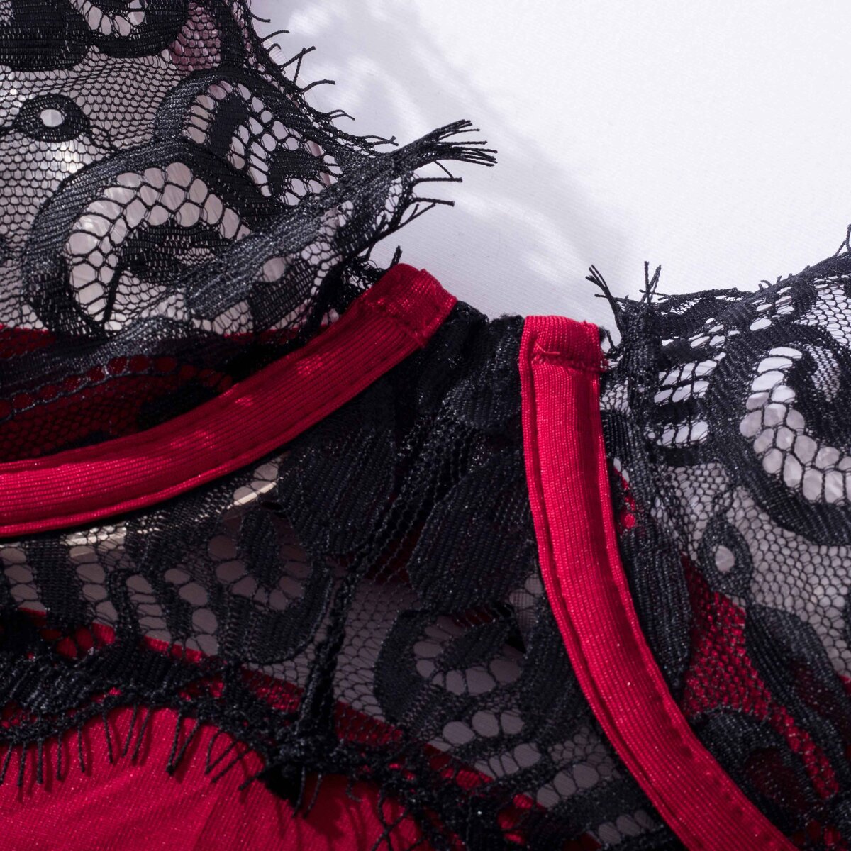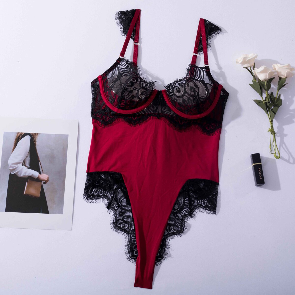 • Υφασμάτινο ολόσωμο κορμάκι με λεπτομέρεια δαντέλας στα cups του σουτιέν και στο μπικίνι για μια πινελιά τσαχπινιάς και θηλυκότητας