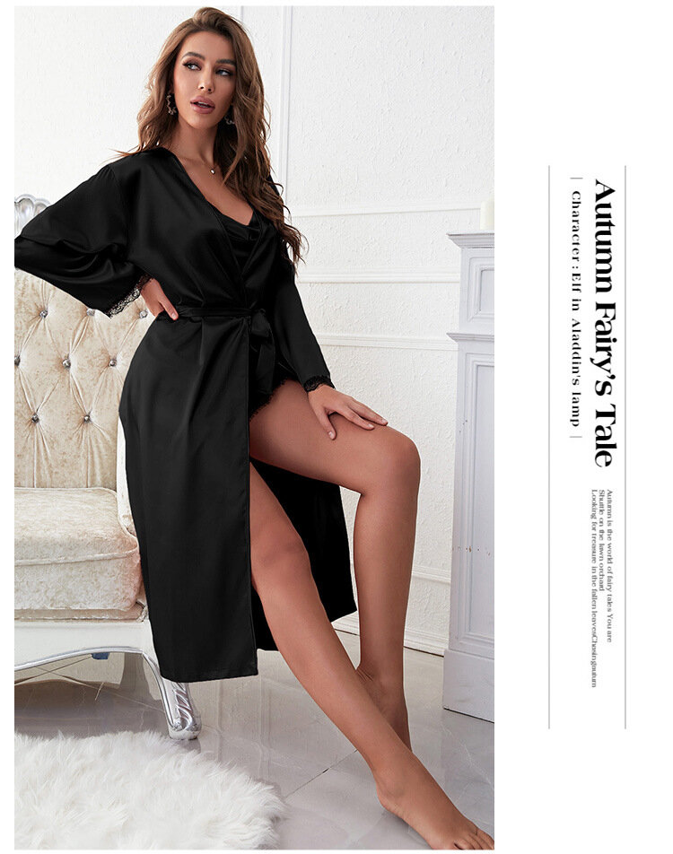 Ασορτί μακρυμάνικη ρόμπα με ζώνη που δένει στη μέση και λεπτομέρεια δαντέλας στα μανίκια σε σατέν υφή για να σου προσφέρει την κάλυψη που χρειάζεσαι όταν την έχεις ανάγκη