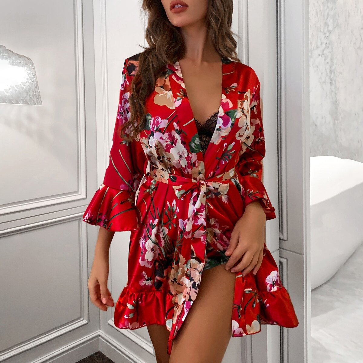 Ασορτί φλοράλ ρόμπα με ζώνη που δένει στη μέση και βολάν στα μανίκια και στο κάτω μέρος για μια πιο θηλυκή εμφάνιση και σίγουρη κάλυψη όταν την χρειάζεσαι