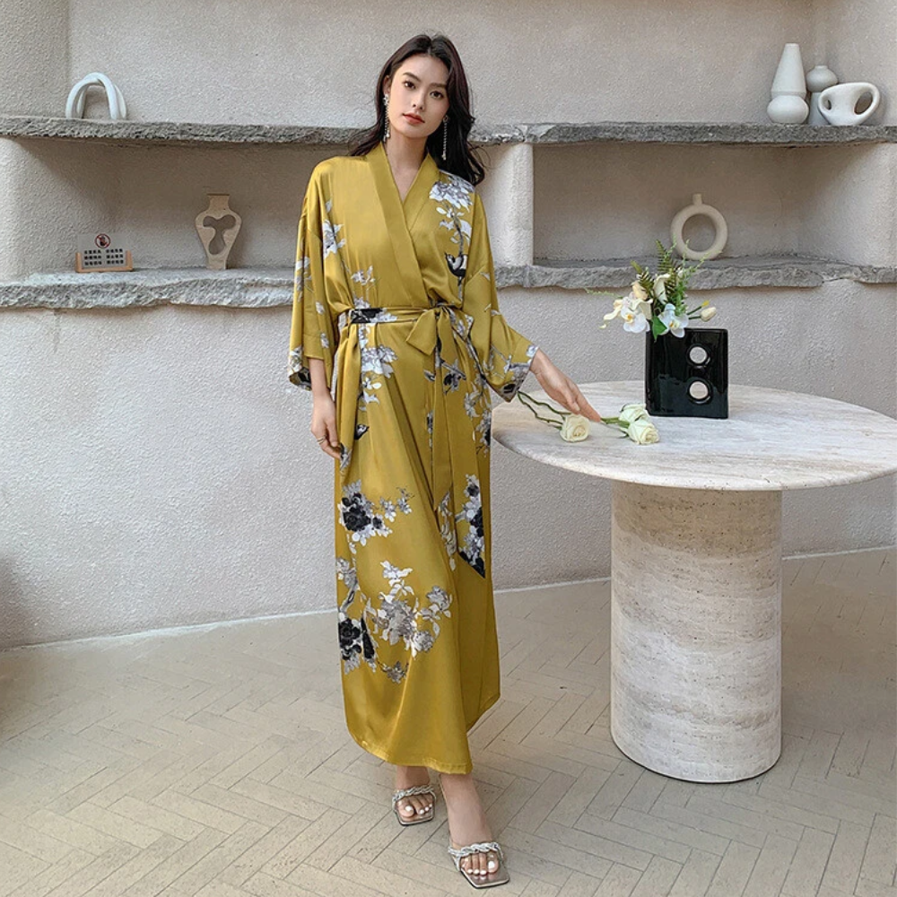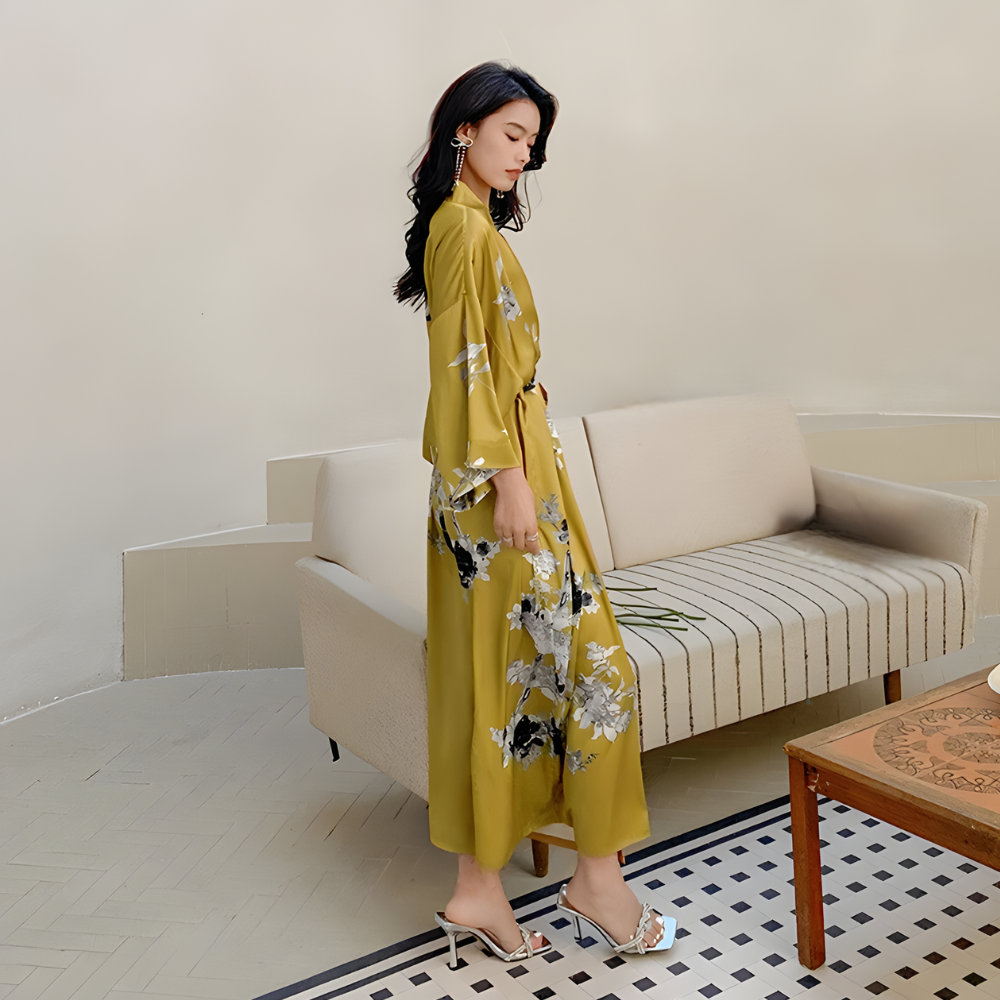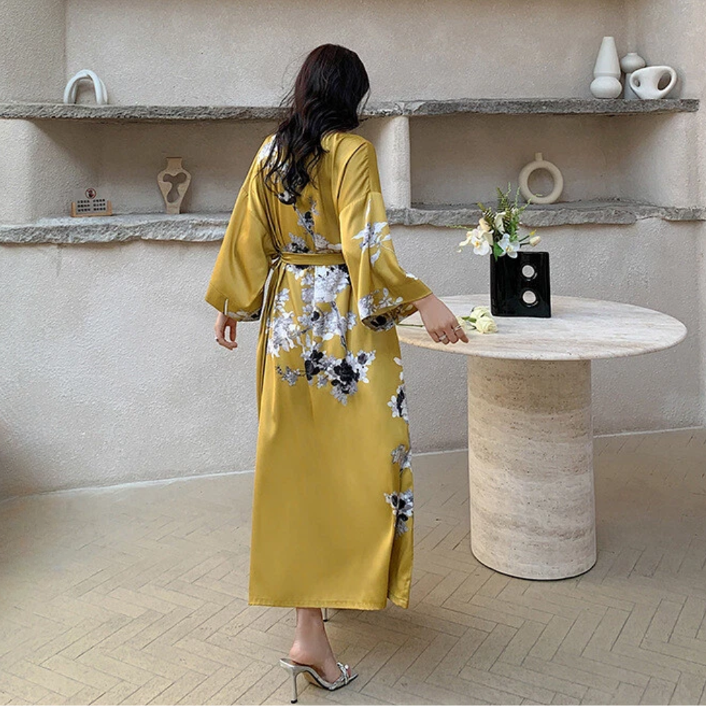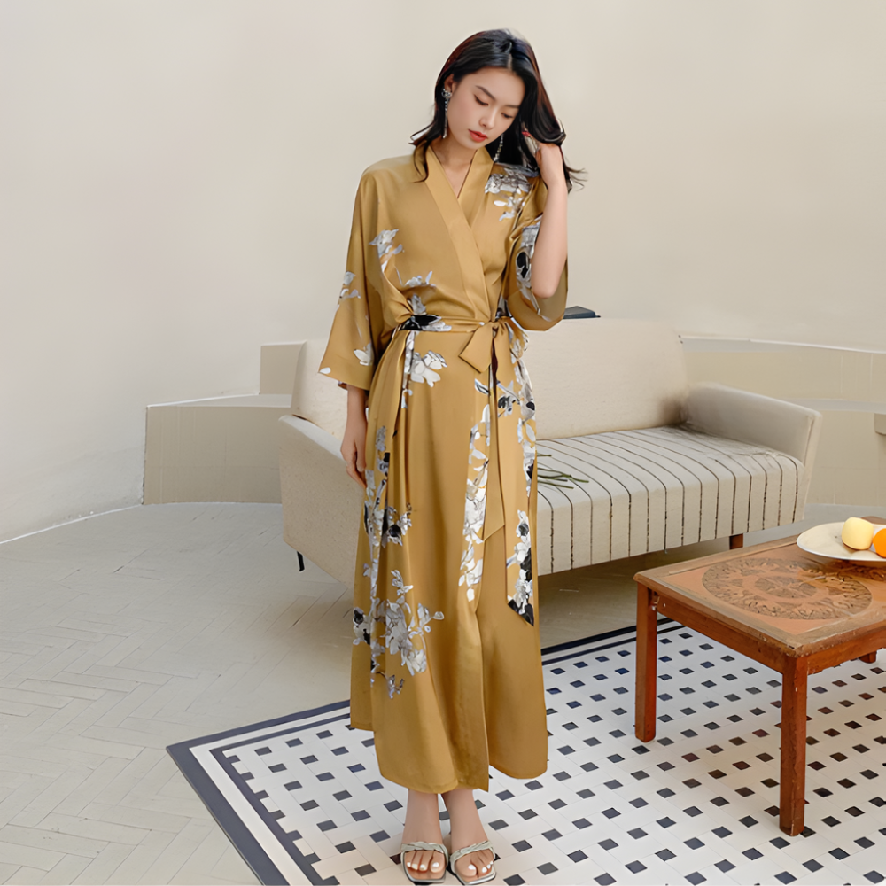Η ρόμπα BALI με το μακρύ μήκος που διαθέτει θα σε καλύπτει ως τις άκρες και την σατέν της υφή που θα σε αγγίζει με απαλότητα δεν θα θες να μην την κάνεις δική σου! Διαθέτει ζώνη για εύκολο δέσιμο γύρω από τη μέση, φαρδύ μακρύ μανίκι και κινέζικο φλοράλ μοτίβο σε μουσταρδί χρώμα που θα γοητεύσει!