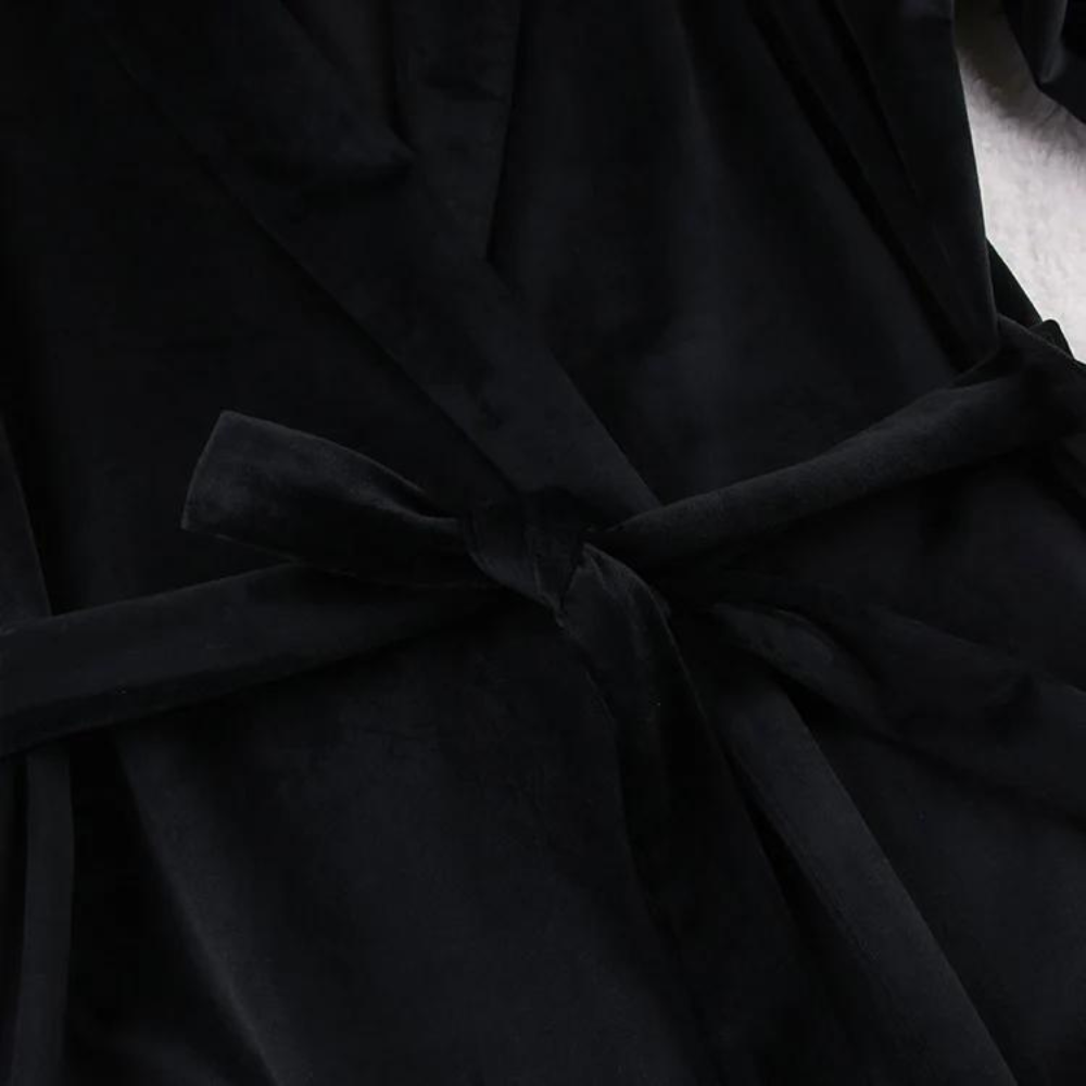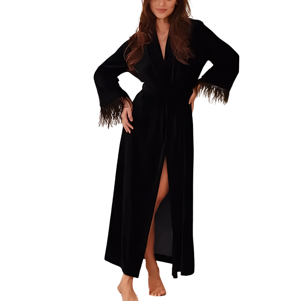 NATALI Μακριά βελούδινη μακρυμάνικη ρόμπα με δέσιμο με ζώνη & πούπουλα στα μανίκια