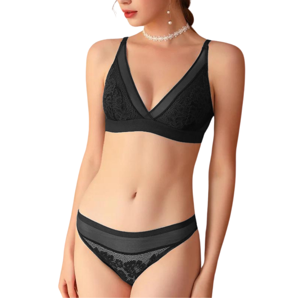 VALERIA Ημιδιάφανο σετ εσωρούχων με φλοράλ μπραλέτ με θήκη τριγωνάκι χωρίς μπανέλα & ασορτί βρακάκι