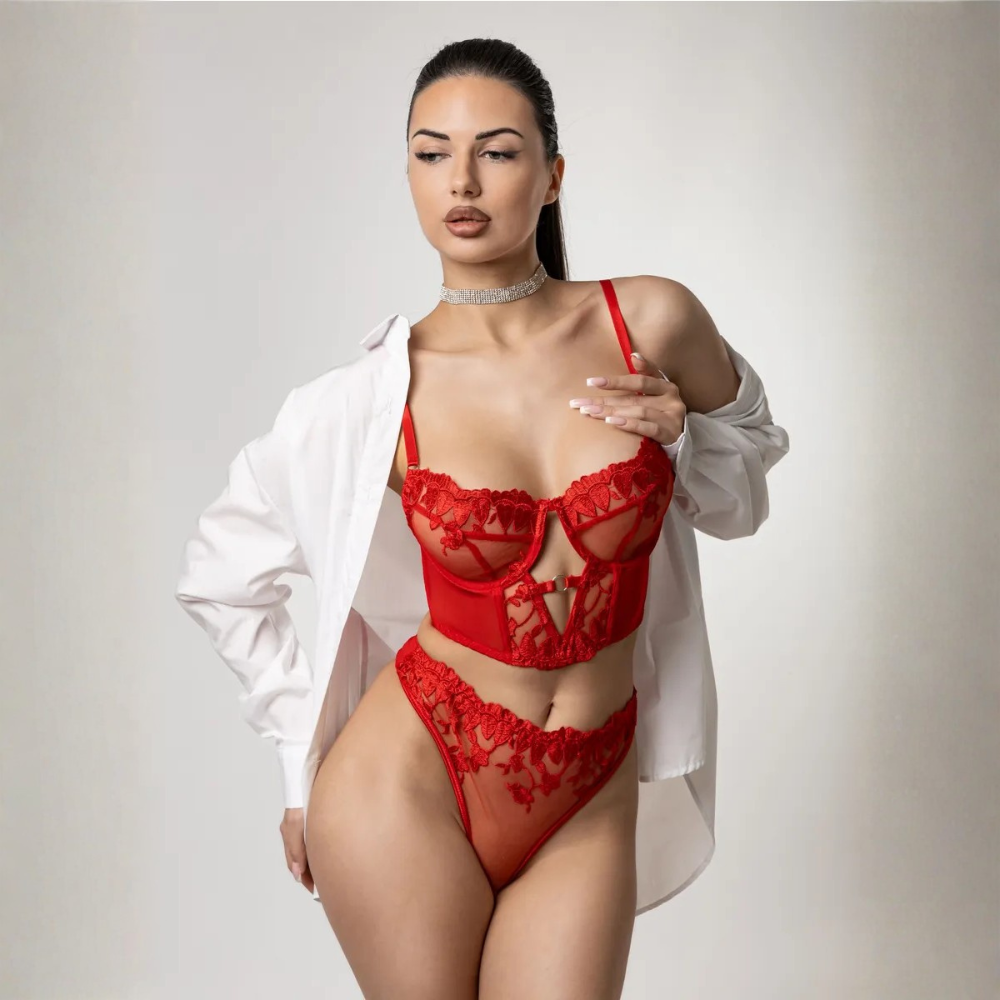 Το σετ εσωρούχων LIZA με κορσέ με ανάγλυφο κεντητό φλοράλ σχέδιο, διαφάνεια, μπανέλα, ανοίγματα κάτω από το μπούστο και ψηλόμεσο ασορτί διάφανο στρινγκ με επένδυση στον καβάλο και κεντητά λουλούδια είναι εγγύηση ότι θα κολακεύσει στο απροχώρητο τη σιλουέτα σου!