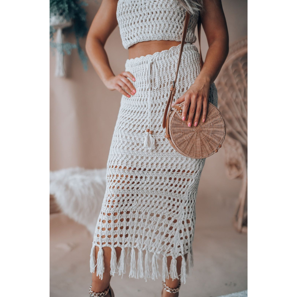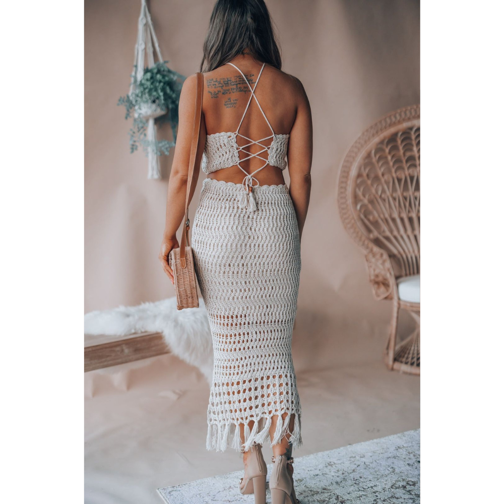 Βγείτε στον καλοκαιρινό ήλιο με το σετ δύο τεμαχίων MERA σχεδιασμένο για τη μοντέρνα γυναίκα που λατρεύει να συνδυάζει το στυλ με την άνεση. Αυτό το σετ διαθέτει ένα κομψό τοπ με ιδιαίτερα πλεκτά μοτίβα που αποπνέουν μποέμικη γοητεία. Το επάνω μέρος δένει στο πίσω μέρος , εξασφαλίζοντας τέλεια εφαρμογή, ενώ προσθέτει μια πινελιά γοητείας με το σχεδιασμό του με ανοιχτή χιαστί πλάτη. Το τοπ συμπληρώνει η ψηλόμεση φούστα, που αναδεικνύει τη σιλουέτα και προσφέρει άνετη εφαρμογή. Η φούστα διαθέτει κορδόνι στη μέση για προσαρμογή και μικρά φουντάκια στο στρίφωμα, ενισχύοντας το boho vibe.