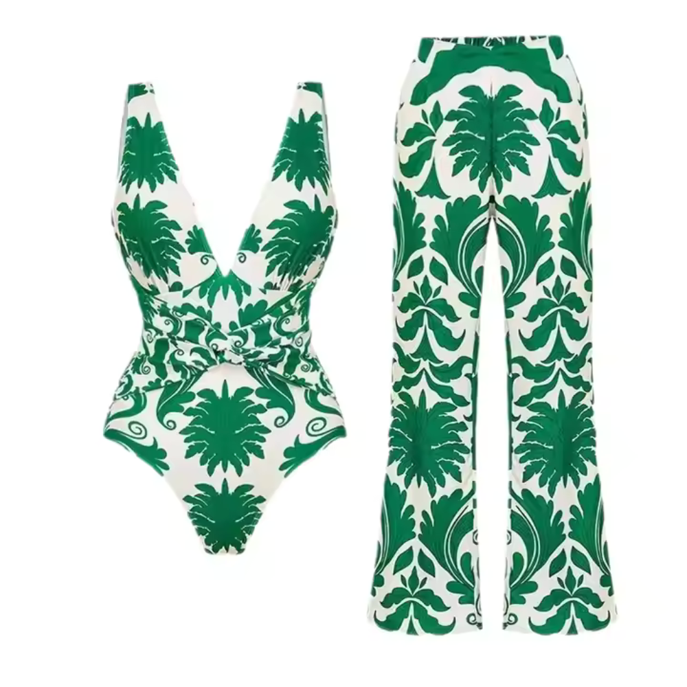 Το μαγιό διαθέτει βαθύ V ντεκολτέ, έξυπνο κόψιμο στη μέση και print που αγκαλιάζει τις καμπύλες. Το ψηλόμεσο, φαρδύ παντελόνι με το ίδιο μοτίβο δημιουργεί την απόλυτη resort εμφάνιση – ιδανική για καλοκαιρινά πάρτι, poolside brunch ή μια απόδραση στην Ίμπιζα.
