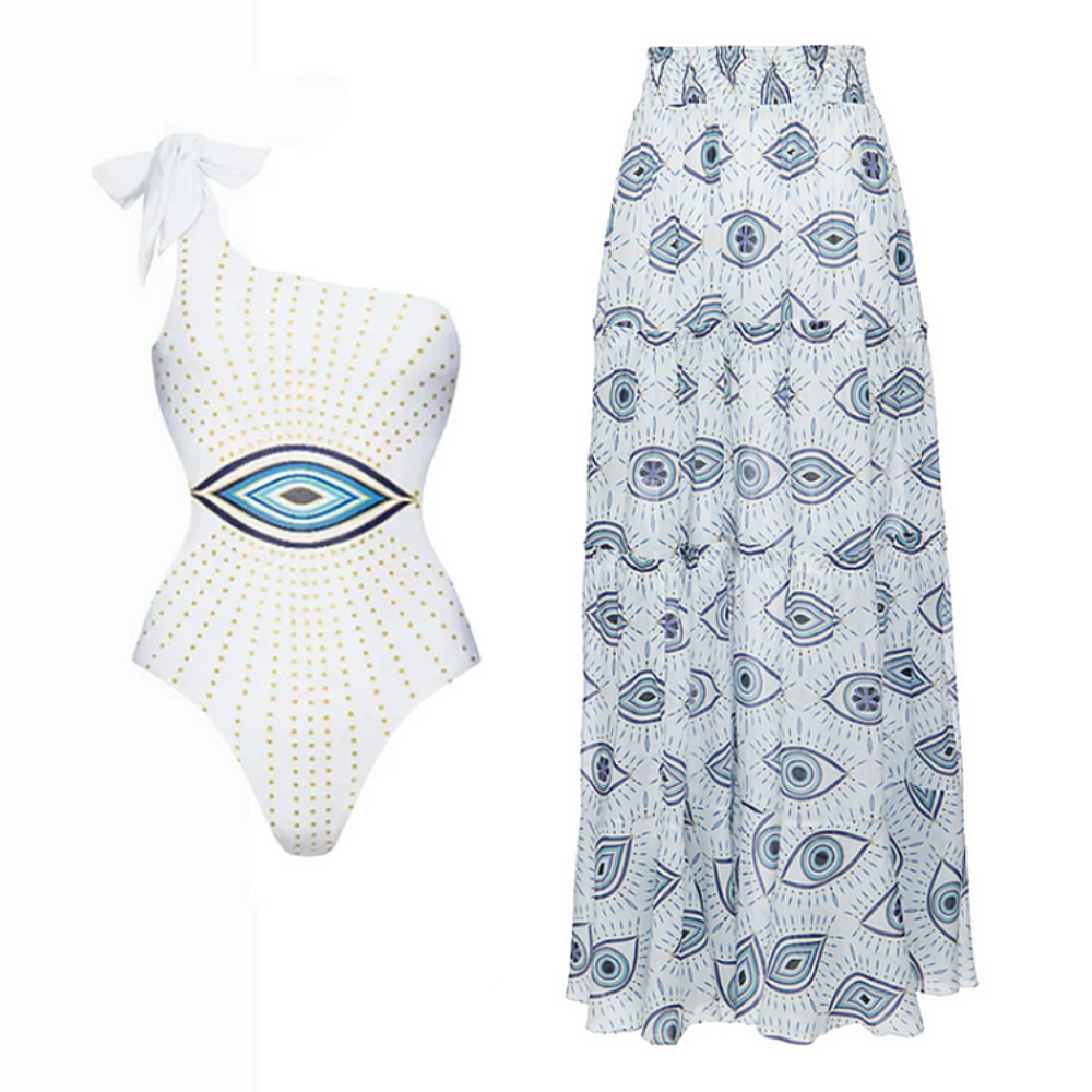 Το καλοκαίρι είναι γεμάτο σύμβολα, και το EYE OF THE SUN τα φέρνει όλα μαζί σε ένα σετ που συνδυάζει στυλ και ενέργεια. Το ένα ώμο κόψιμο του μαγιό δίνει μοντέρνο χαρακτήρα, ενώ το μοτίβο με το μάτι του ήλιου στη μέση λειτουργεί σαν fashion φυλαχτό που μαγνητίζει τα βλέμματα.