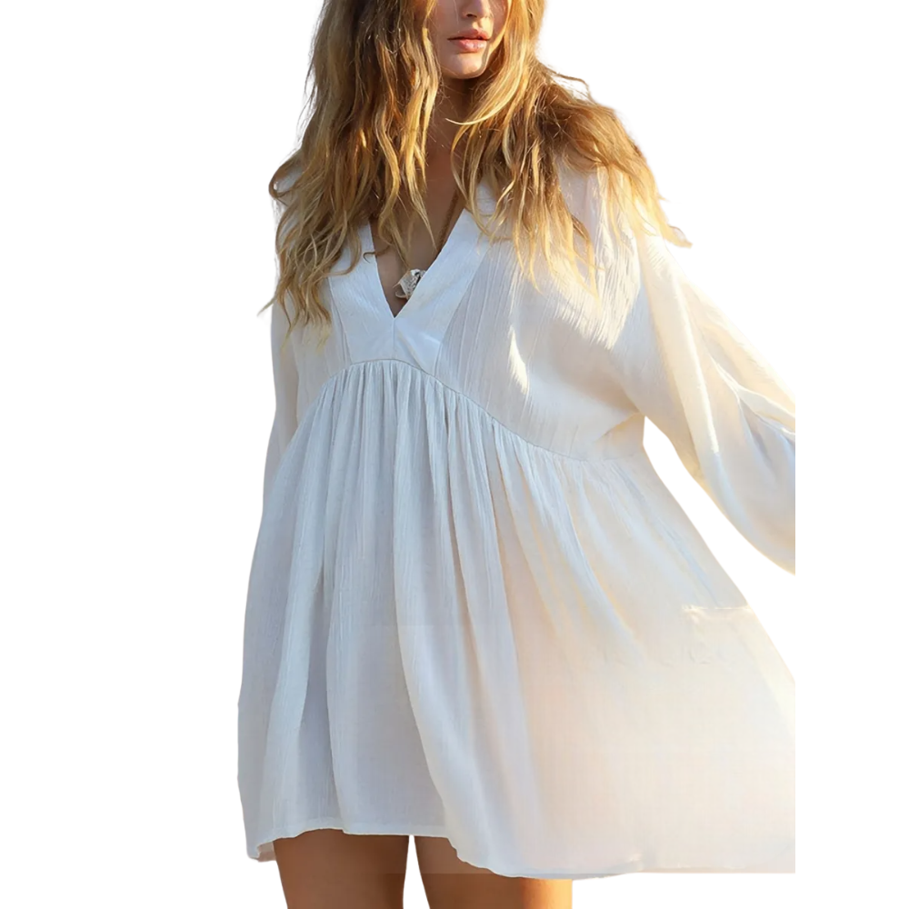 SALT WHISPER Λευκό φόρεμα θαλάσσης με πτυχώσεις και φουσκωτά μανίκια