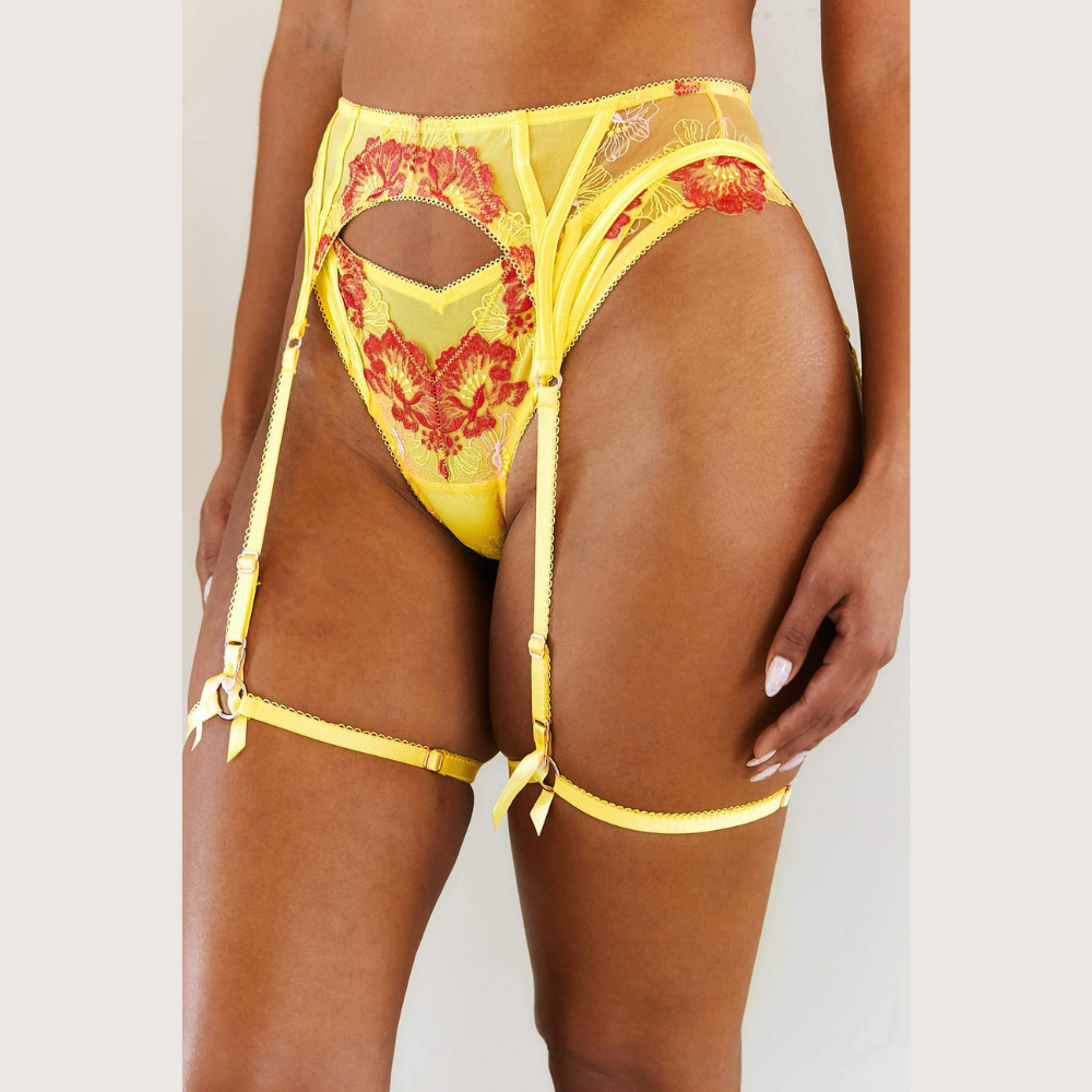 Το THALEIA είναι ένα ξεχωριστό σετ εσωρούχων που παντρεύει τη λάμψη με τη φινέτσα. Η βάση από διάφανη κίτρινη δαντέλα σε συνδυασμό με το πλούσιο κόκκινο λουλουδένιο κέντημα δημιουργεί έναν μοναδικό αισθησιακό συνδυασμό. Το σετ περιλαμβάνει σουτιέν με μπανέλα, μπραζιλ εσώρουχο και ασορτί ζώνη ζαρτιέρας με ρυθμιζόμενα λουράκια στους μηρούς.