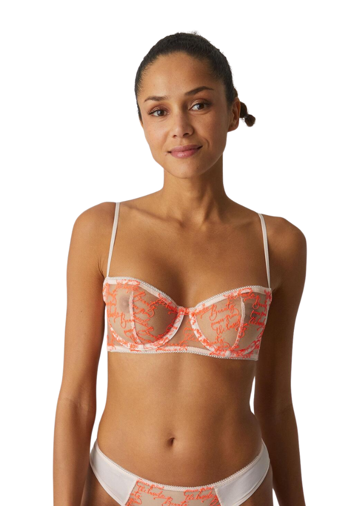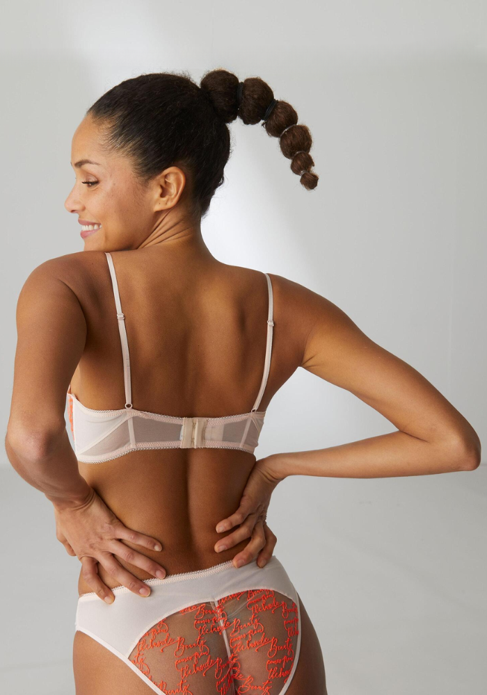 Το REINA είναι ένα κομψό μπαλκονέ σουτιέν με μπανέλα, που αναδεικνύει το στήθος με θηλυκή γραμμή και διακριτική διαφάνεια. Το σχέδιο με γράμματα στο τούλι προσθέτει μοντέρνα αισθητική, ενώ η μπαλκονέ γραμμή χαρίζει ανόρθωση και φυσικό σχήμα.