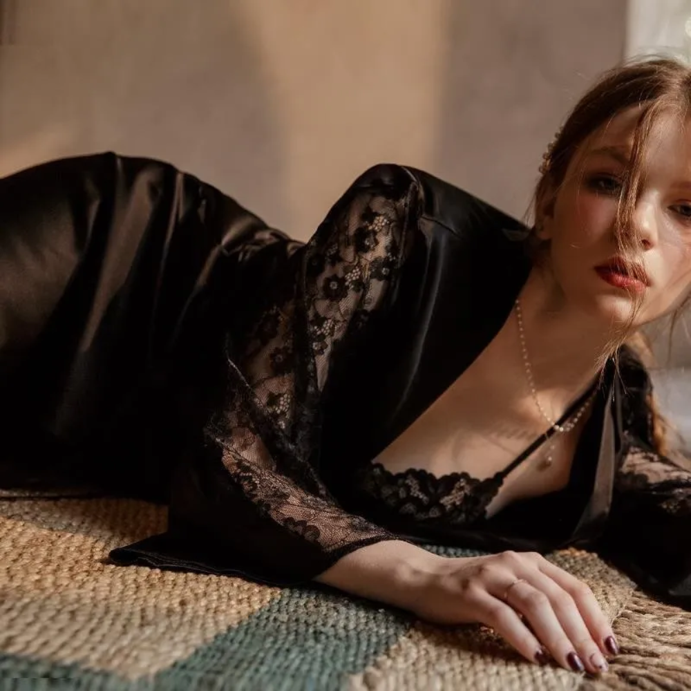 Αισθησιακό και άκρως ακαταμάχητο το γυναικείο αυτό σατέν σετ νυχτικό με ρόμπα CHARLOTTE με δαντελένιο αποκαλυπτικό και βαθύ μπούστο και ρόμπα με λεπτομέρεια δαντέλας στα μανίκια θα σε ανεβάσει επίπεδο!