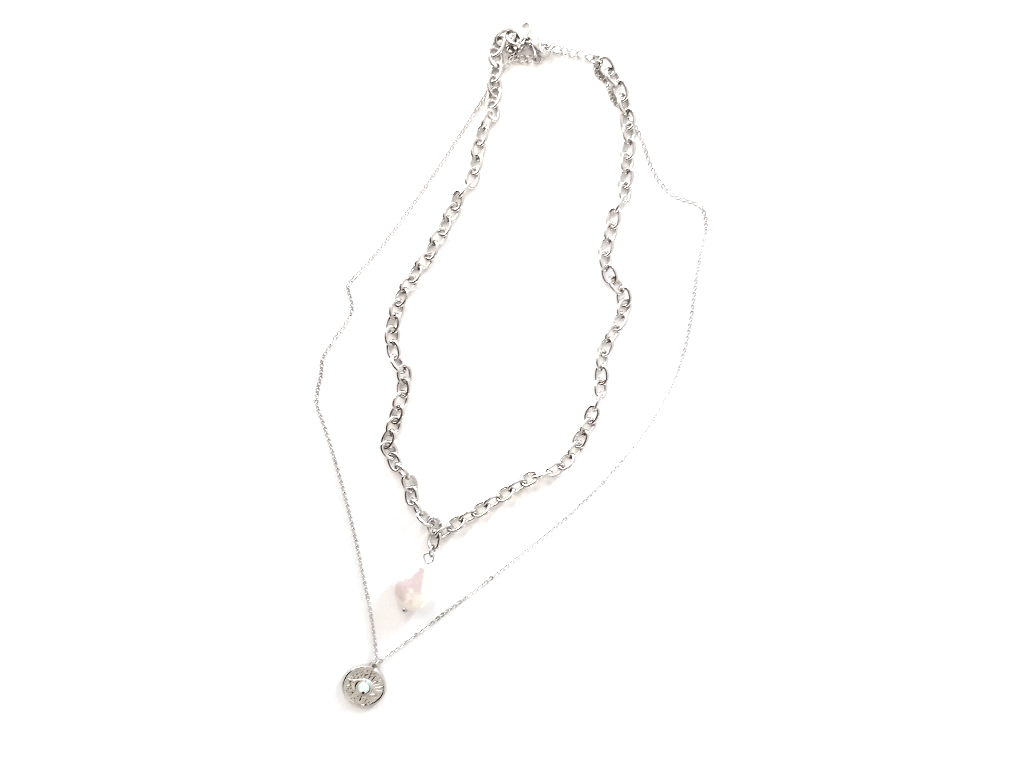 Το συγκεκριμένο κολιέ εχει 2 διαφορετικά κολιέ που κουμπώνουν ως ένα. Το βρίσκουμε σε ασημί απόχρωση, που  ταιριάζει σε όλους τους τύπους δέρματος.