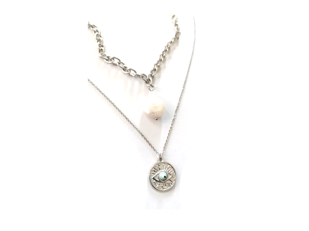 Στο πιο μακρύ κολιέ κρέμεται το μεταλλικό στοιχείο ματάκι για να μην σας ματιάζουν και το πιο κοντό κολιέ έχει πιο χοντρή αλυσίδα και στην άκρη του το κοσμεί ένα φανταστικό κρεμαστό τύπου μαργαριτάρι.
